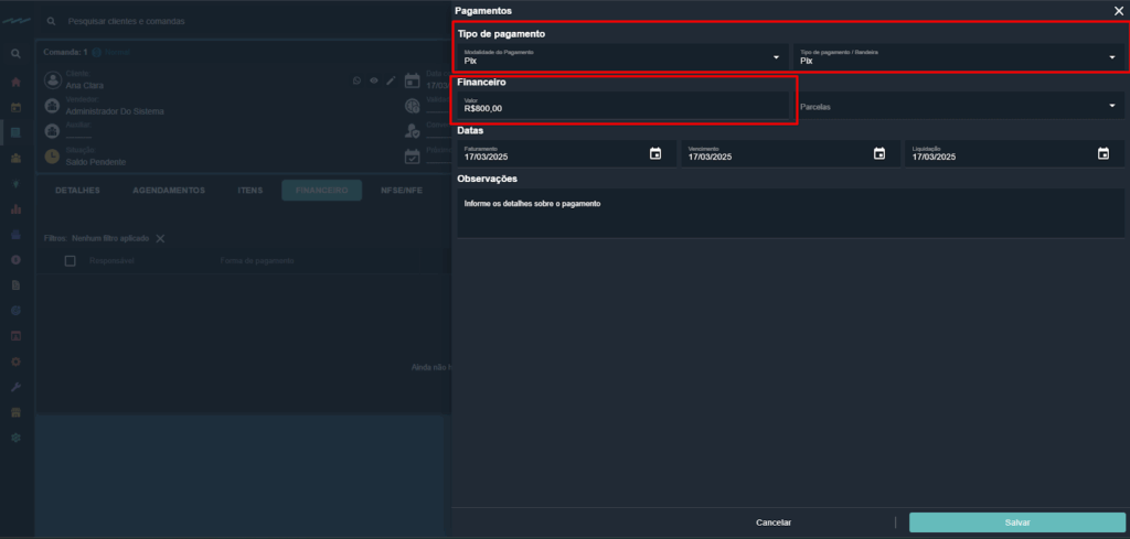 Nesse exemplo o pagamento de R$ 800,00 foi registrado via Pix como entrada, as seguintes alterações serão visíveis: