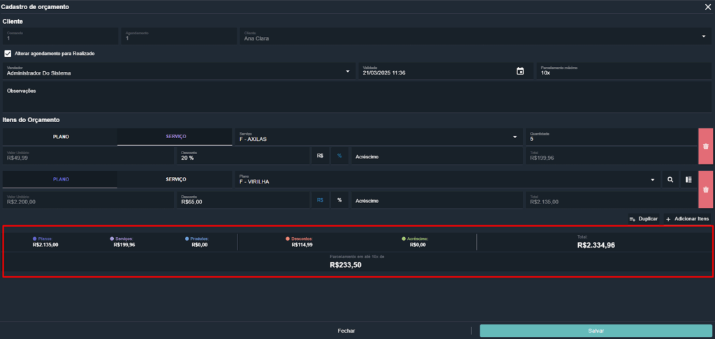 - O sistema calculará automaticamente o valor total das sessões, considerando eventuais descontos ou acréscimos.