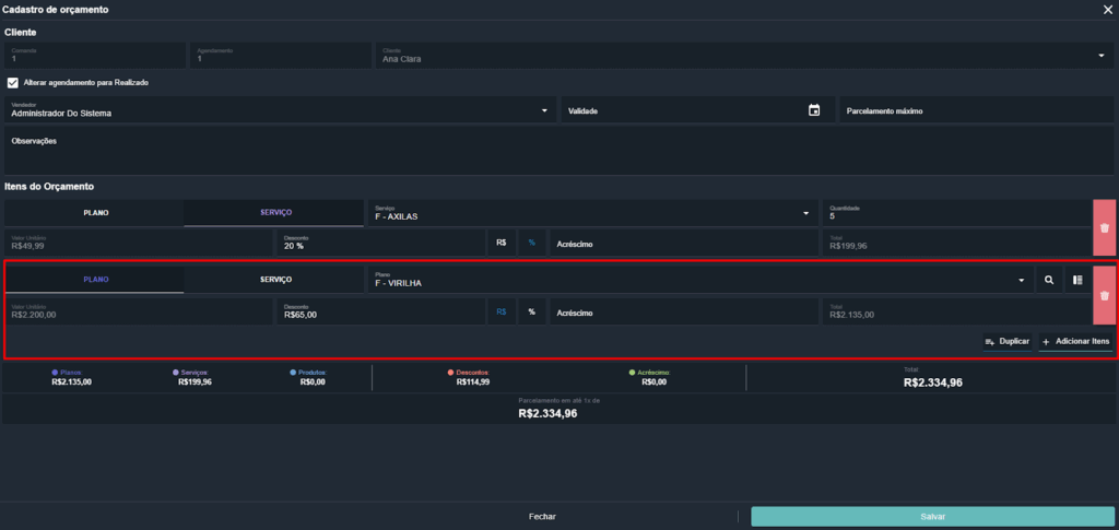 - Um novo quadro será exibido para que você insira mais um Serviço ou Plano.
