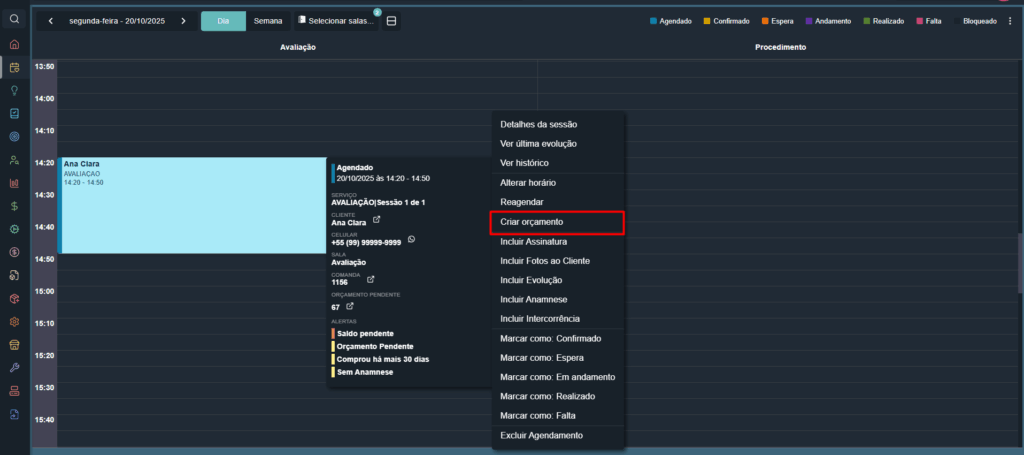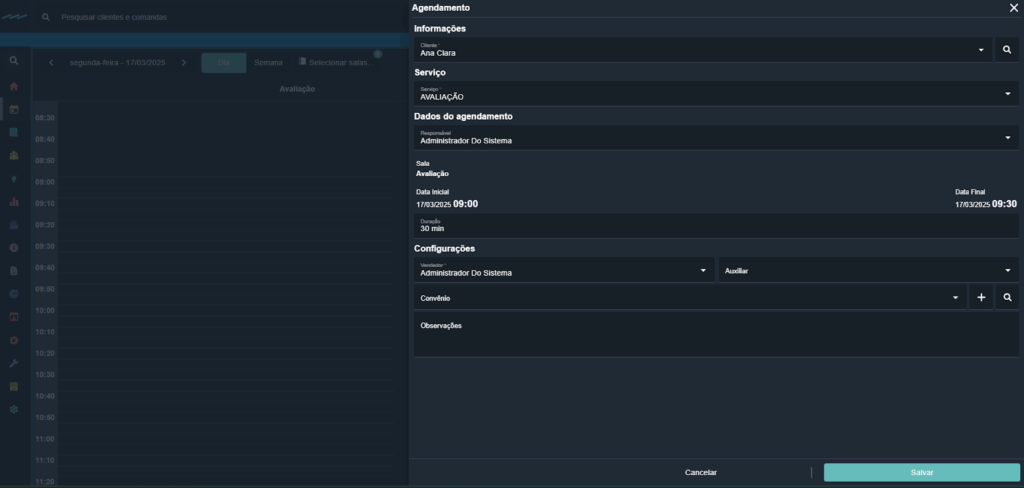 - Acesse a agenda de Avaliações e selecione o horário desejado pelo cliente.
