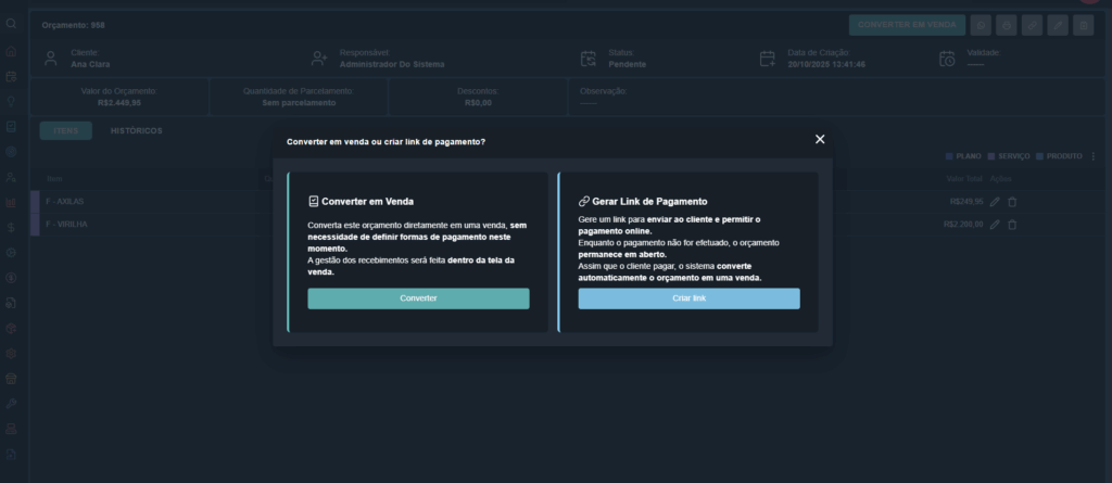 Assim que o cliente pagar, o sistema converte automaticamente o orçamento em uma venda.