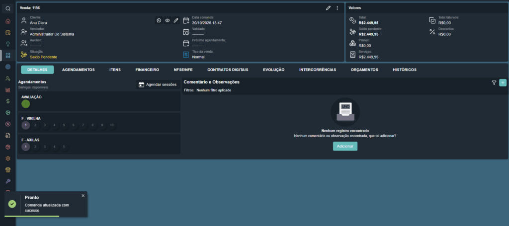 🚀 Pronto! Com essas etapas concluídas, a venda está finalizada e você pode seguir para o agendamento do tratamento.