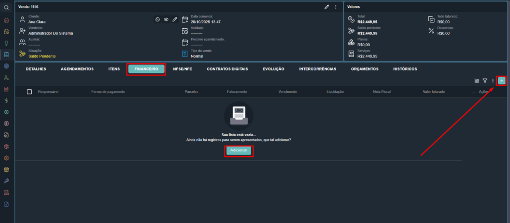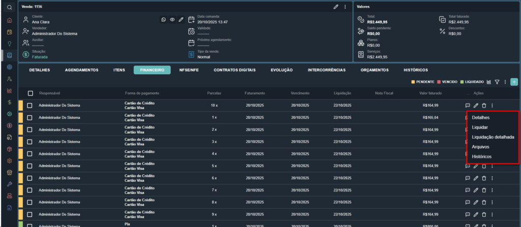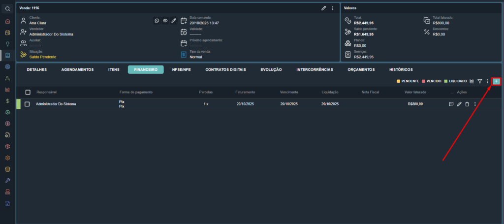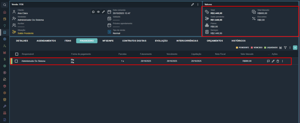 - Saldo Pendente atualizado para R$ 0,00 (indicando que a venda foi faturada).