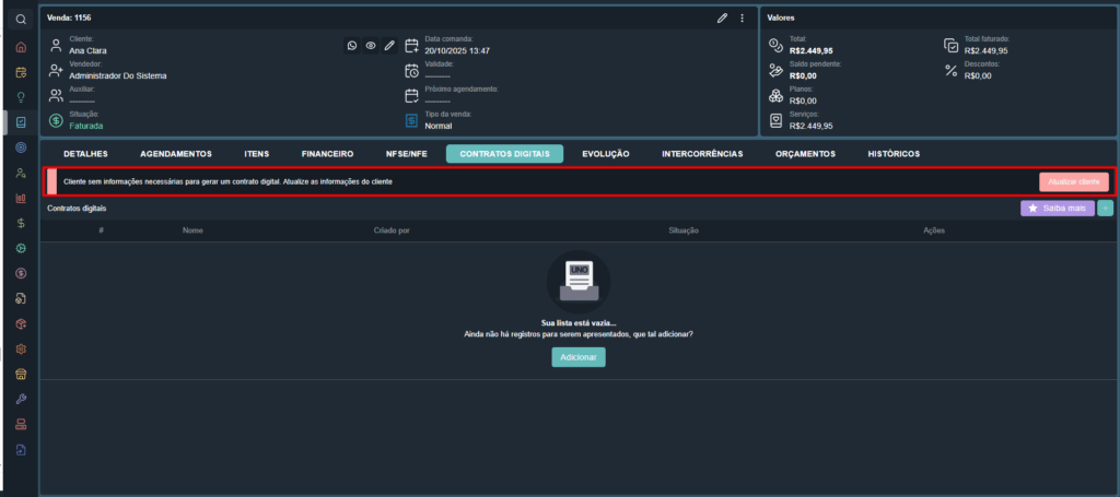 Agora que o financeiro já foi lançado, o próximo passo é gerar o contrato para a assinatura digital do cliente.