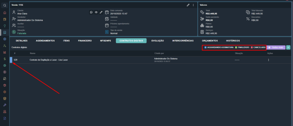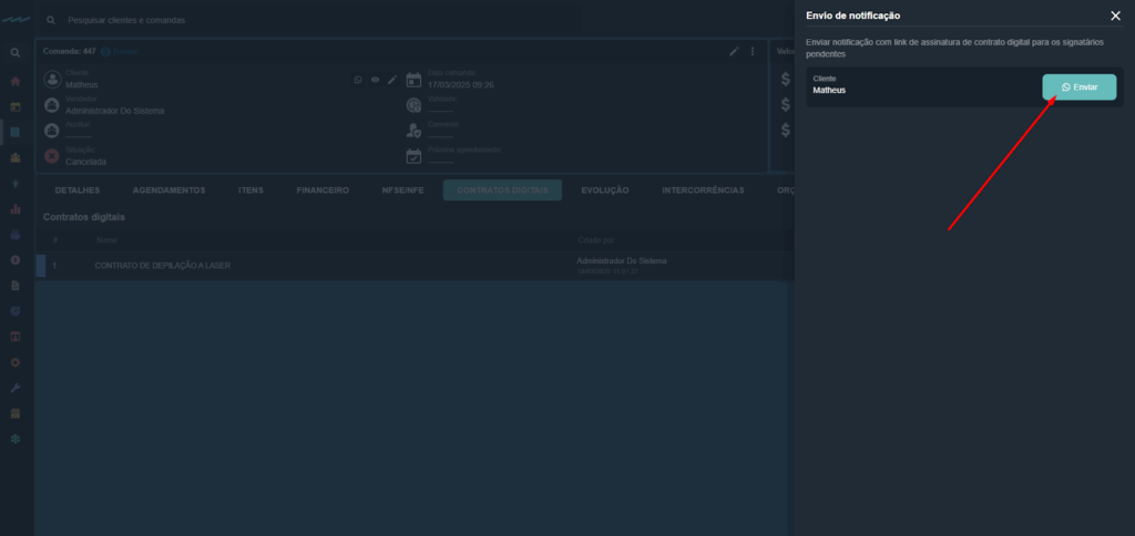 Após o envio, o sistema registrará a ação e exibirá o status do contrato, indicando se ele foi enviado, assinado ou está pendente.
