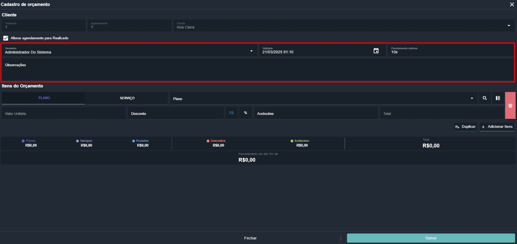 Após selecionar “Criar Orçamento”, o sistema atualizará automaticamente para a página de Cadastro de Orçamentos, já trazendo os dados do cliente em atendimento.
