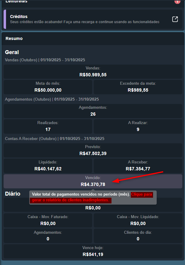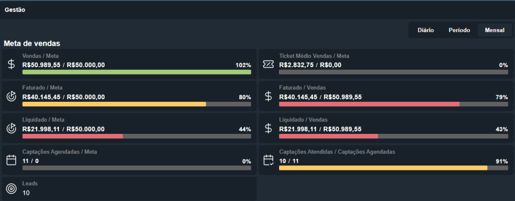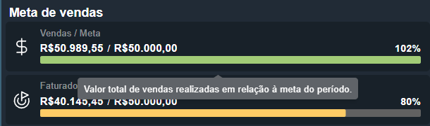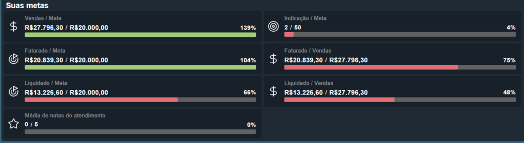Nesse campo, o sistema apresenta uma visualização geral dos valores faturados e liquidados em relação à meta cadastrada (em Configurações > Metas), além dos valores faturados e liquidados sobre o que já foi vendido pela unidade.Ao passar o mouse sobre cada campo, o sistema exibirá uma explicação detalhada sobre o que cada valor representa.