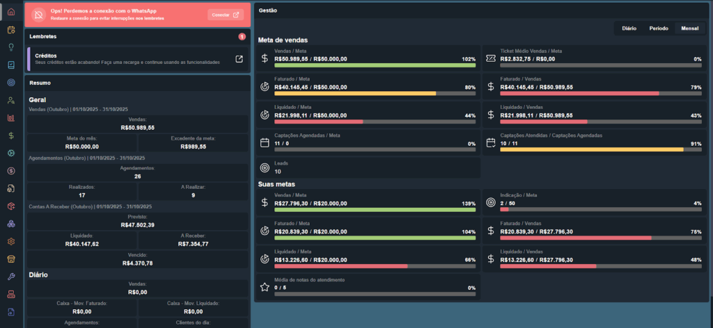 No canto esquerdo da tela, são apresentadas as informações gerais de vendas do mês vigente, incluindo: