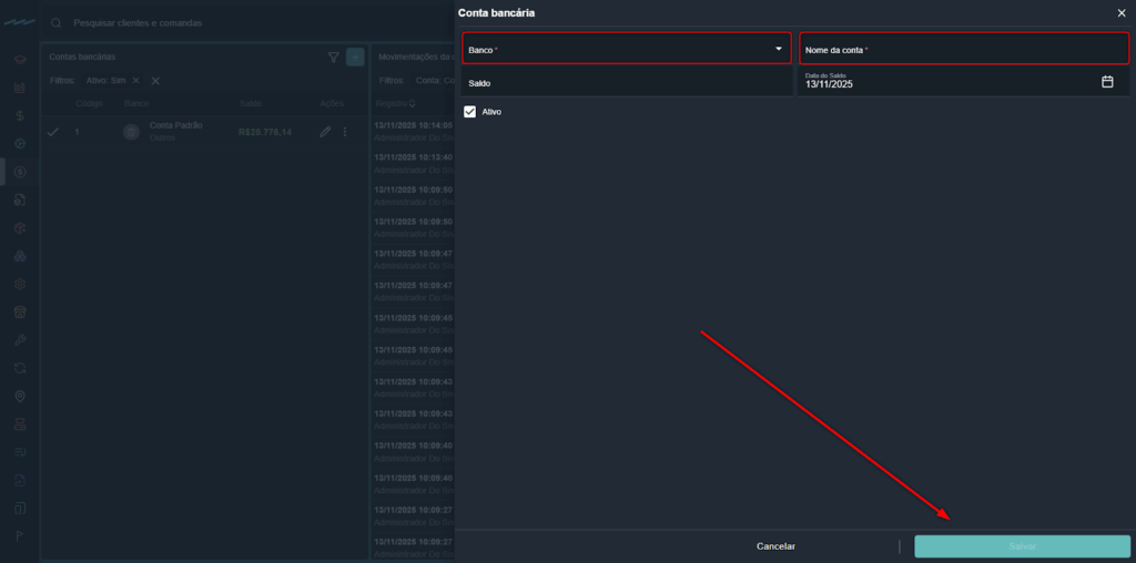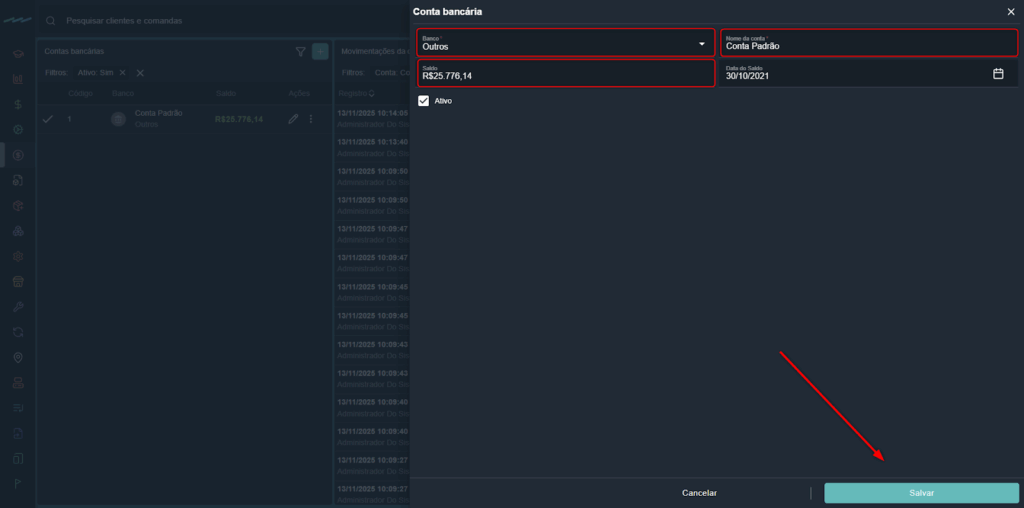 - Saldo inicial: informe o valor atual de saldo da conta no momento do cadastro.