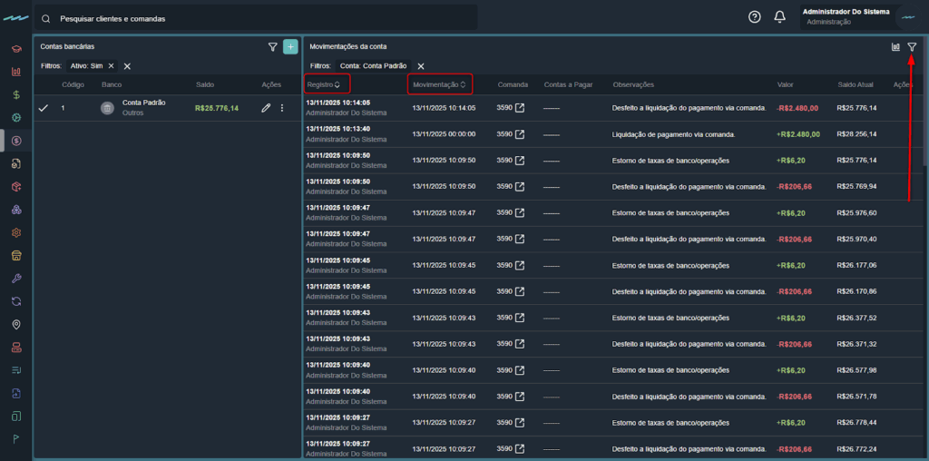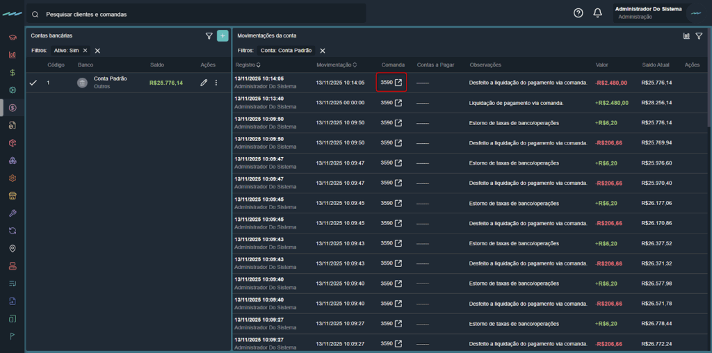 Nas movimentações, é possível acessar diretamente a comanda ou a despesa vinculada, clicando no ícone de atalho disponível ao lado da transação.