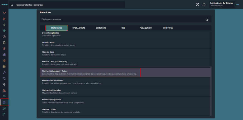 Menu Lateral > Relatórios > Financeiro