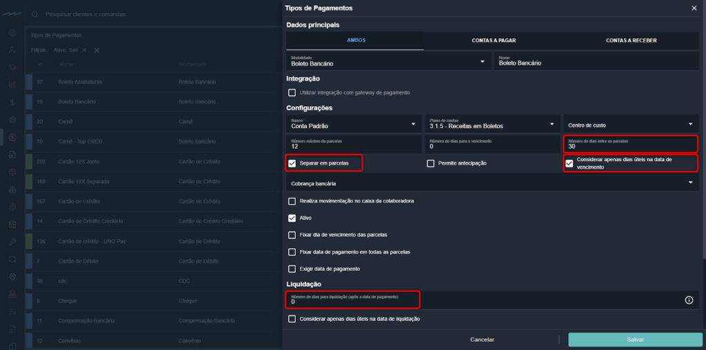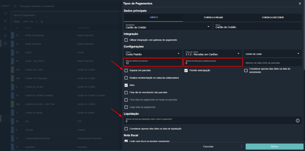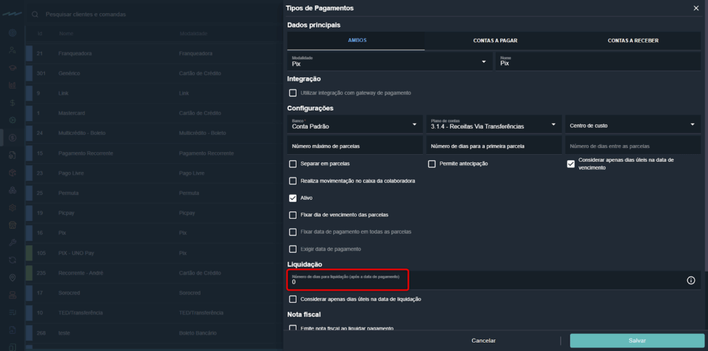 - Liquidação / número de dias para liquidação (após o pagamento): define o prazo para liquidação.