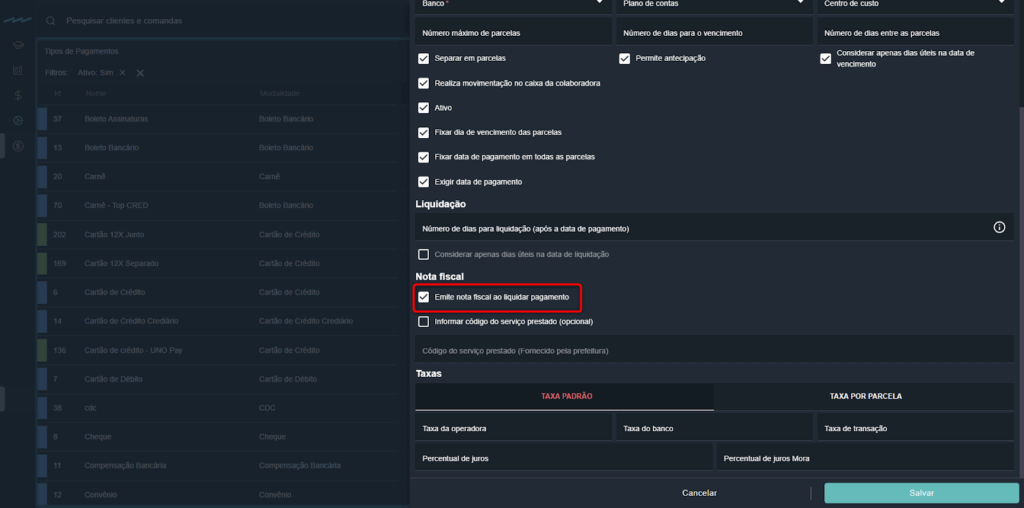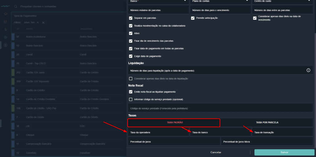 Taxa por Parcela: usada em cartões de crédito, permite definir taxas diferentes conforme o número de parcelas.