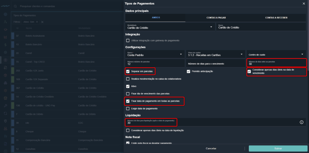 - Ativar “Fixar data de pagamento em todas as parcelas” (obrigatório para liquidação automática).