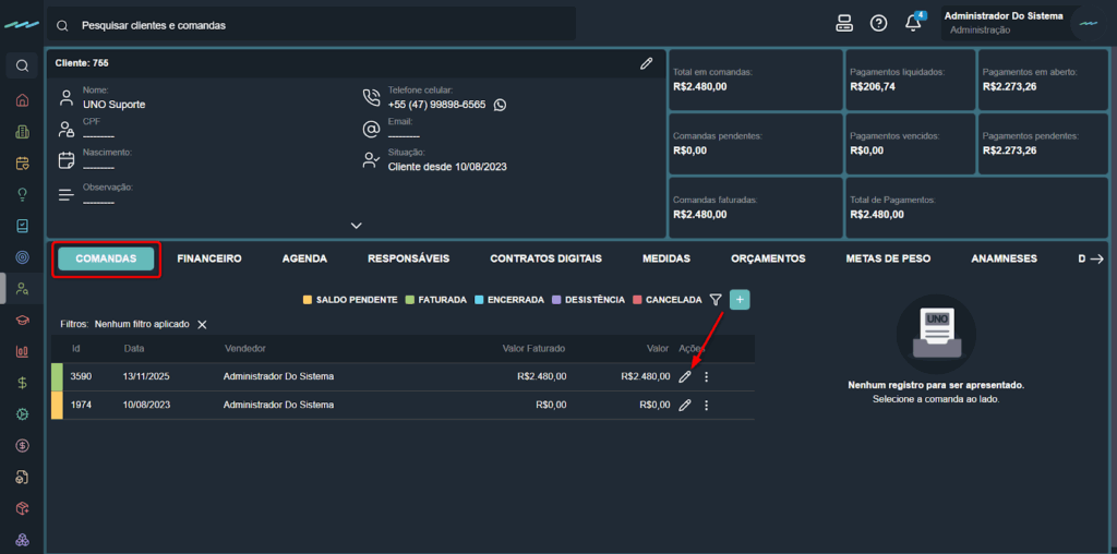 - Vá até a aba Comandas e clique no ícone de lápis para abrir a venda.
