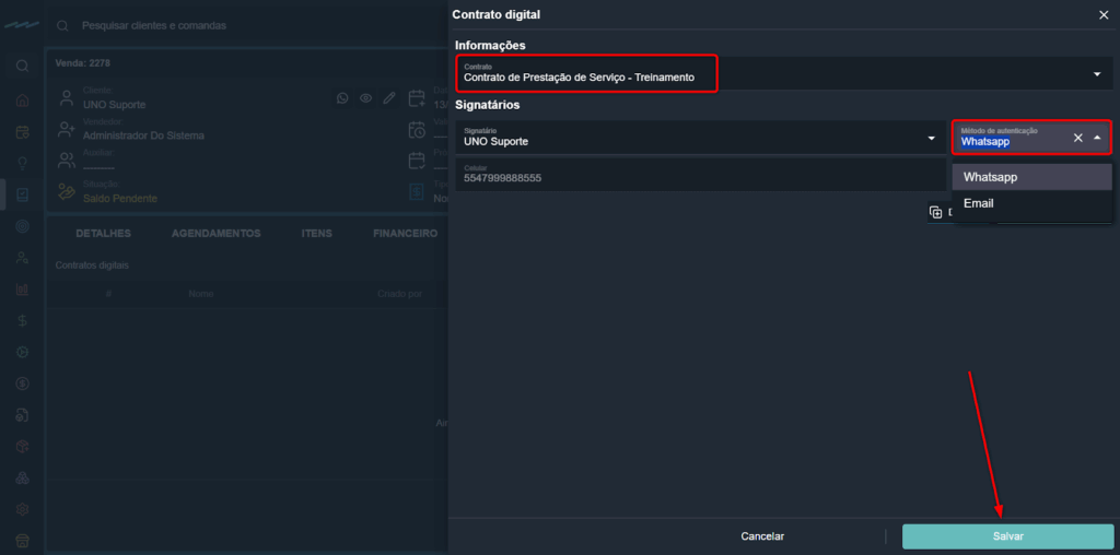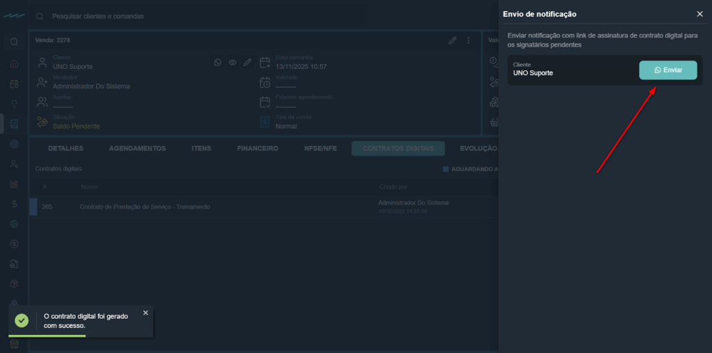 - Via WhatsApp: o sistema abrirá a tela para você enviar a mensagem com o link de assinatura diretamente ao cliente.
