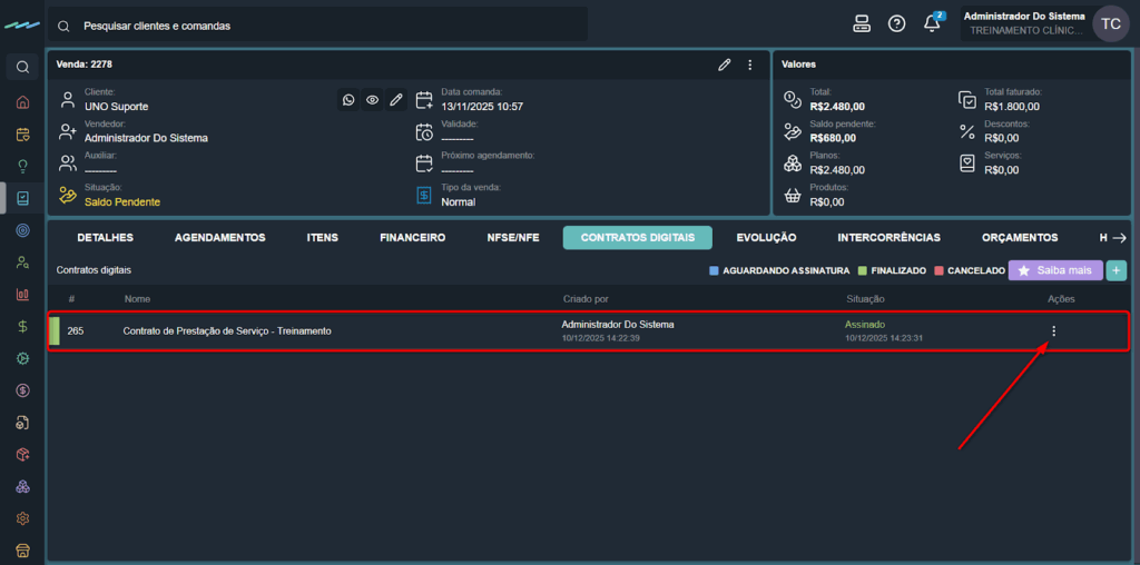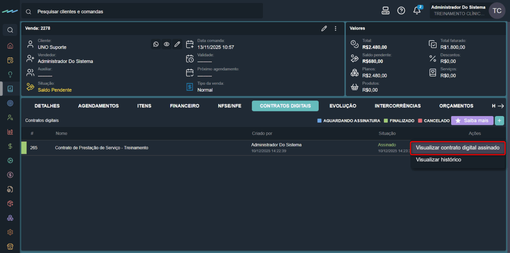 Assim que o cliente concluir a assinatura, o contrato ficará disponível para visualização dentro do sistema, na própria aba de contratos digitais da venda.